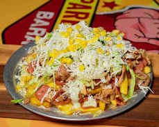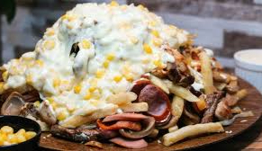 Papa, salchicha,carne hamburguesa,tocineta, costilla ahumada,maiz tierno,ripio papa quesos,salsas