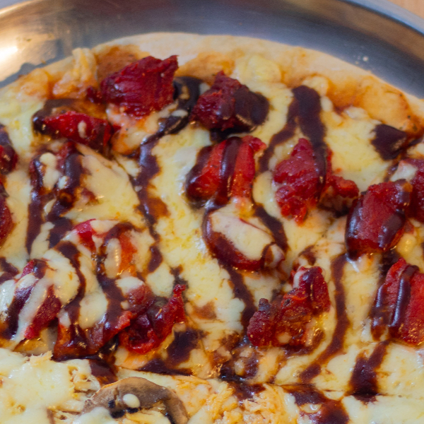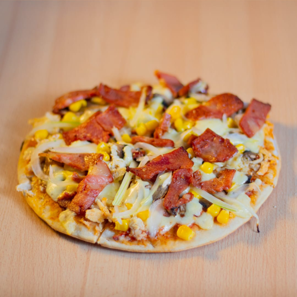 Queso, pollo, cabano, maiz, champiñon y tocineta, cebolla