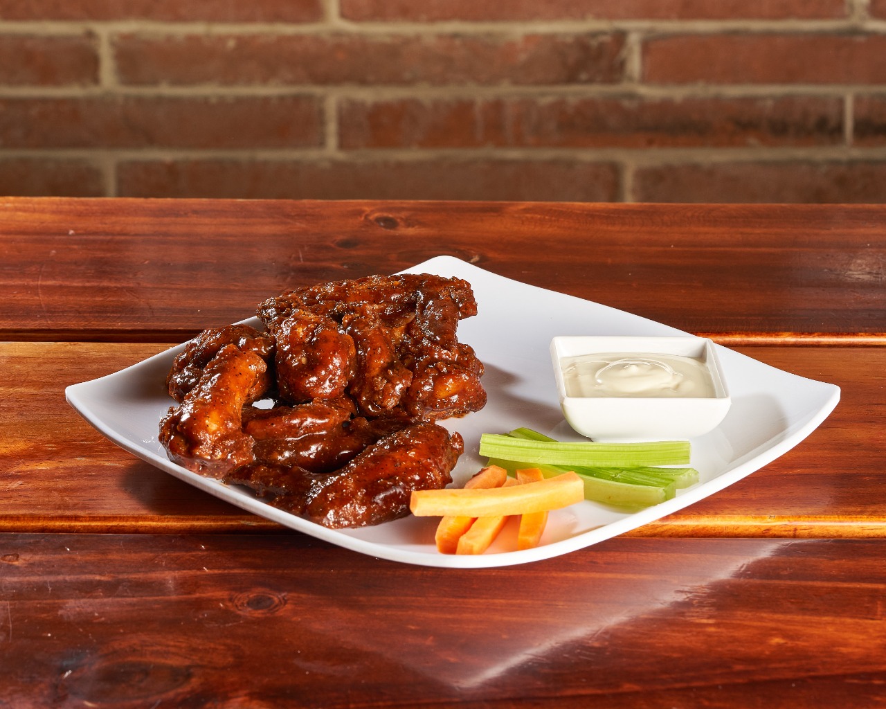Deliciosas alitas, con bastones de zanahoria, apio y sour cream.