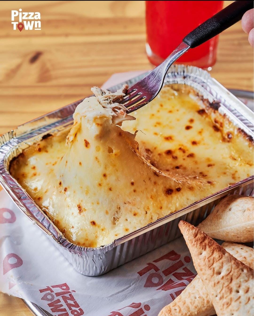 Salsa boloñesa, pasta de lasaña, queso mozzarella, pollo desmechado, salsa bechamel y queso parmesano.