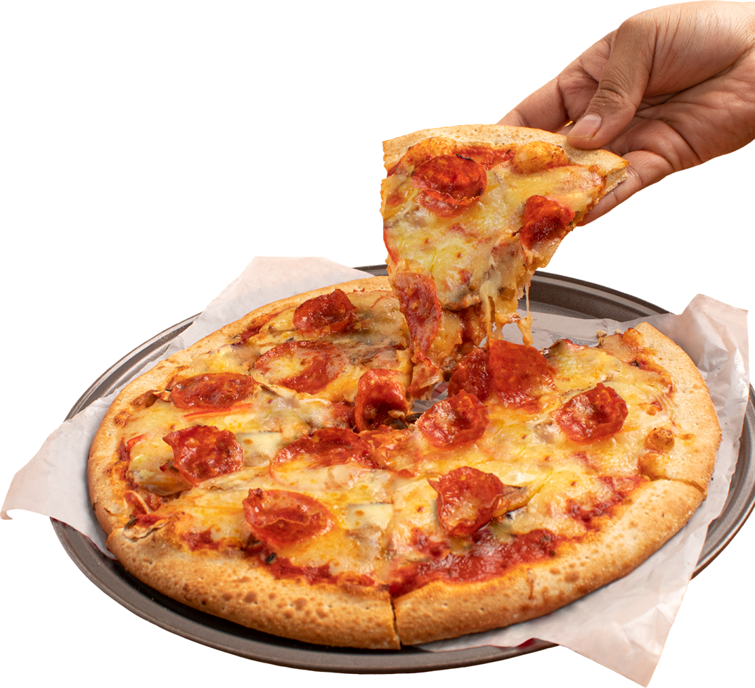 Masa artesanal, salsa napolitana, queso mozzarella, pepperoni, champiñones, cebolla, pimentón y queso parmesano.