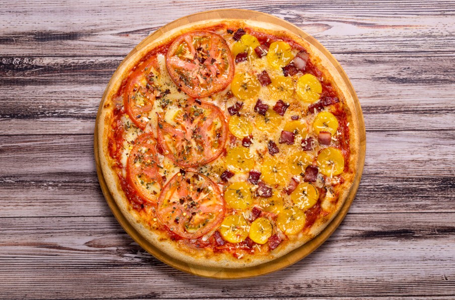 Masa artesanal, salsa napolitana, queso mozzarella, pepperoni, tomate y tocineta ahumada.