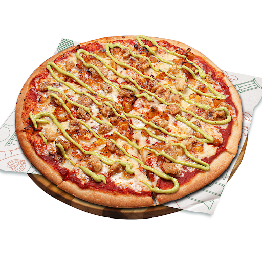 SALSA NAPOLITANA, QUESO MOZZARELLA, PIÑA POLLO DESMECHADO, TOCINETA AHUMADA Y SALSA BBQ