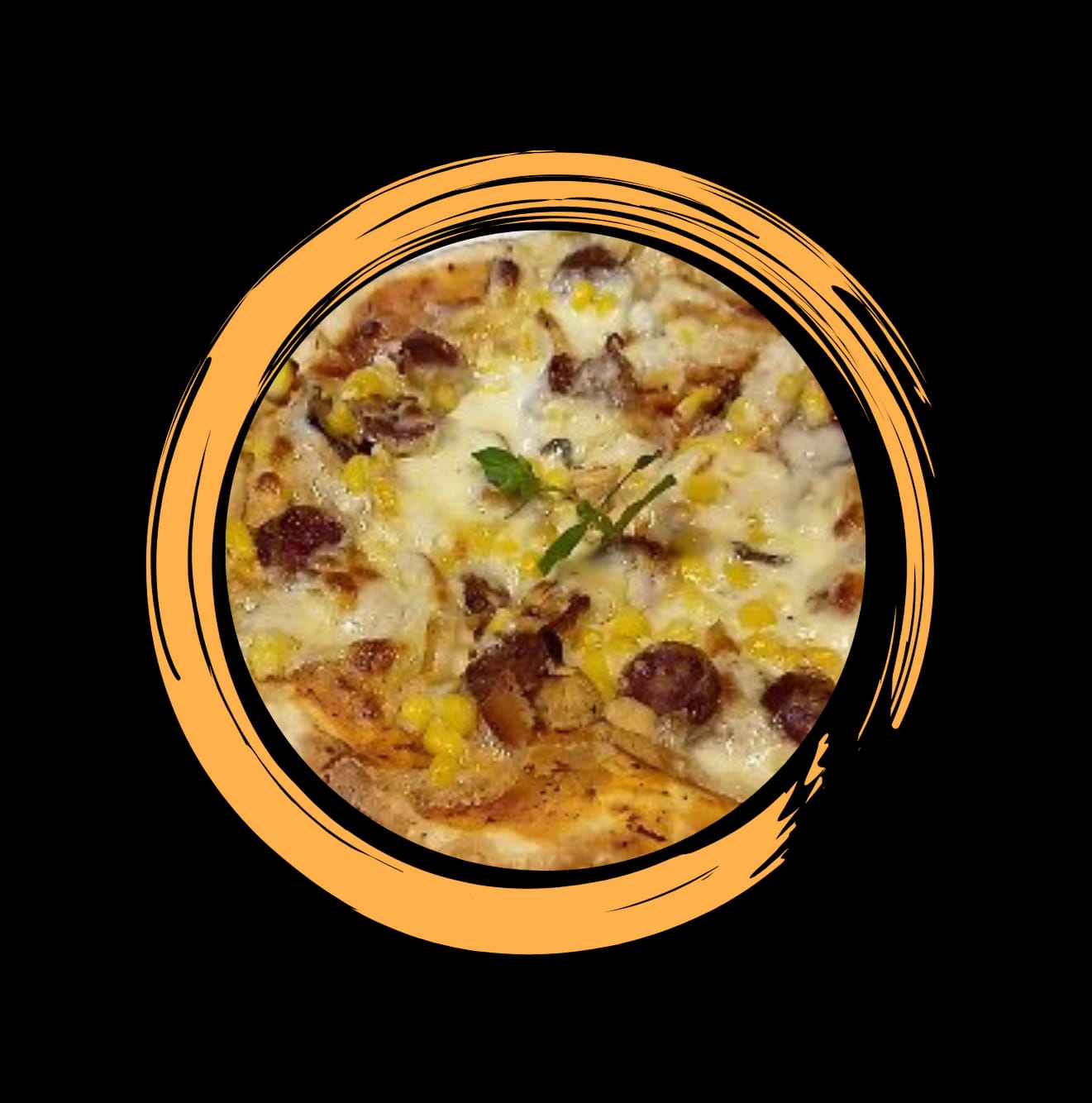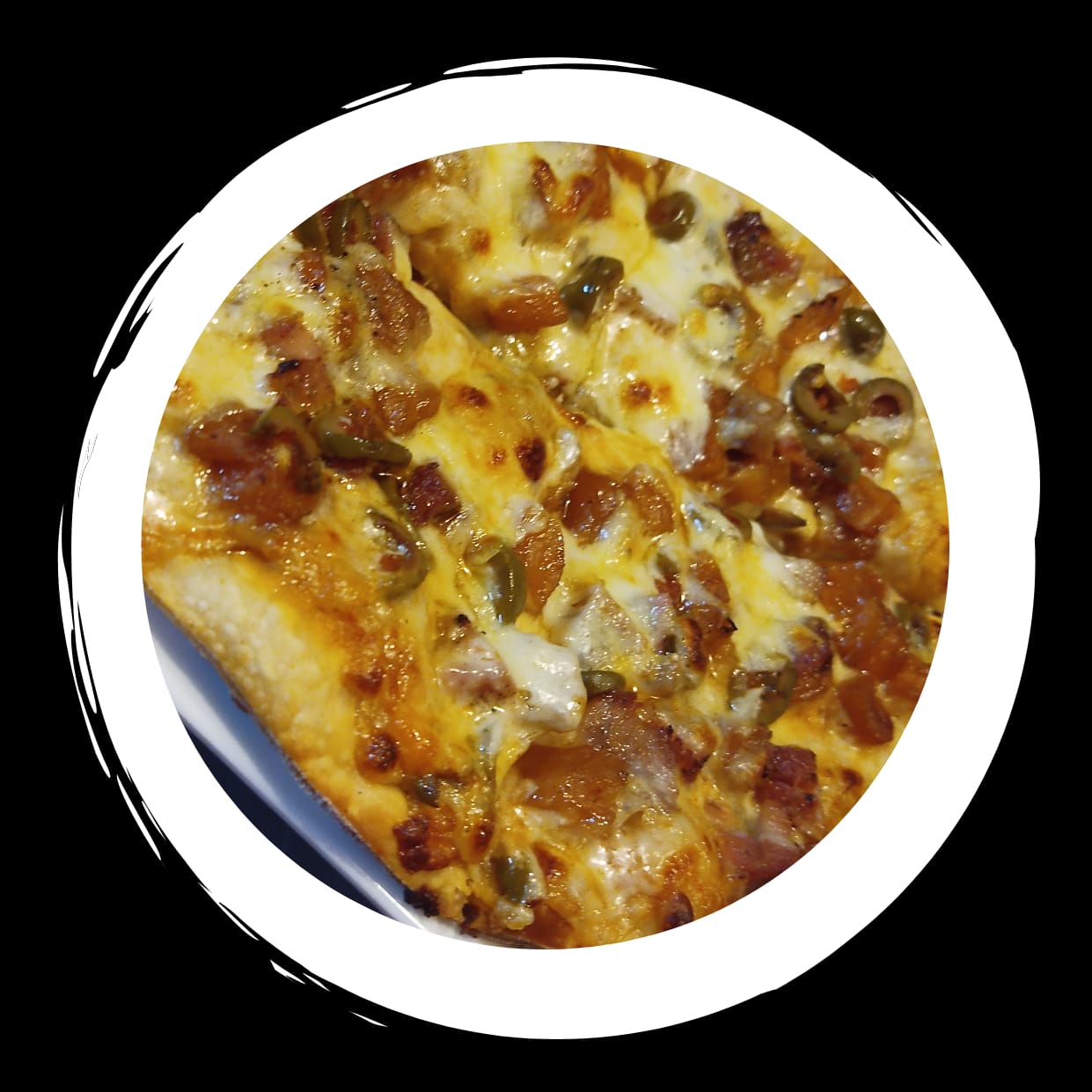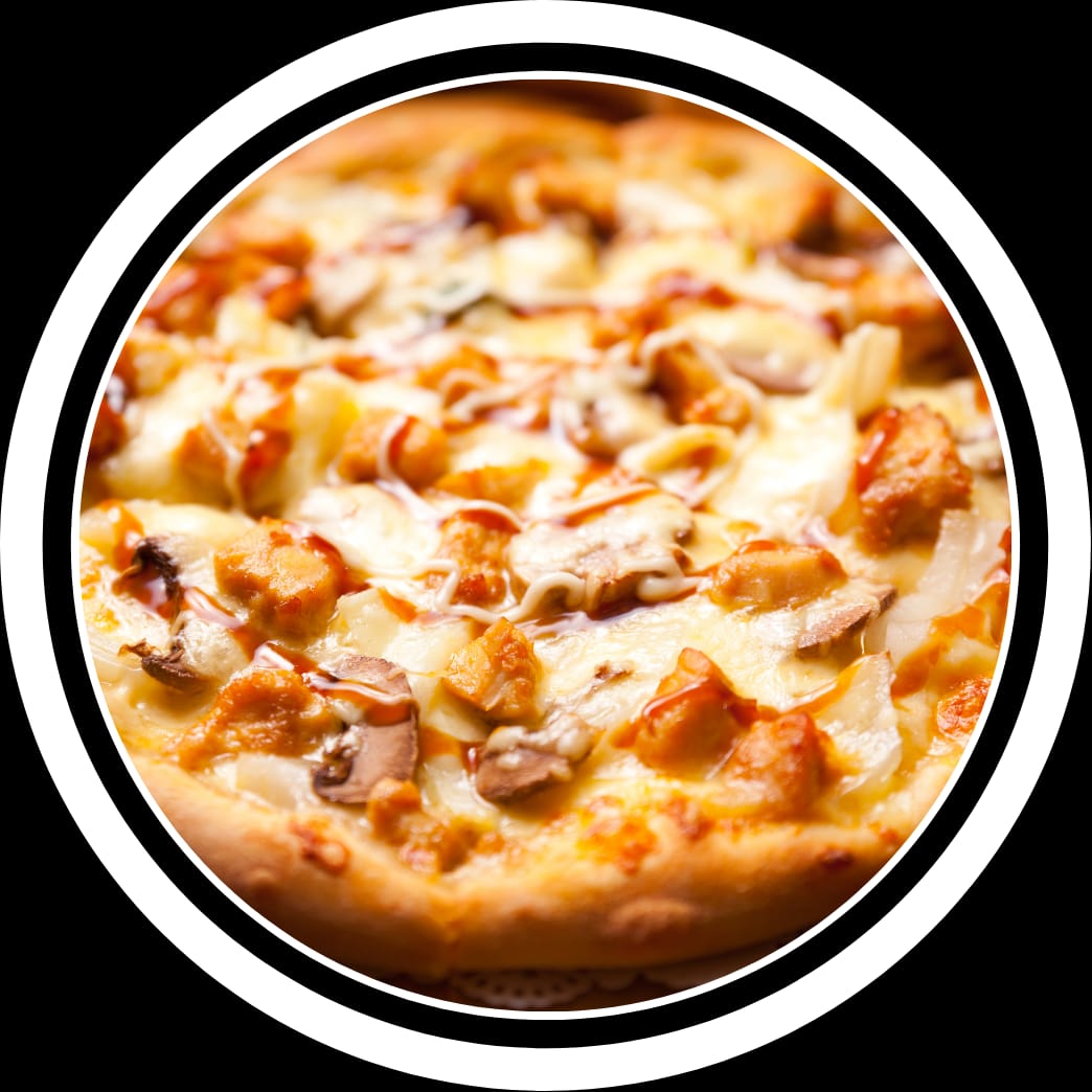 Nuestra exquisita masa artesanal, pasta de tomates naturales, queso de la casa, pollo horneado en salsa BBQ, tocineta asada, maíz dulce y cebolla caramelizada. !Que exquisitez, debes probarla!