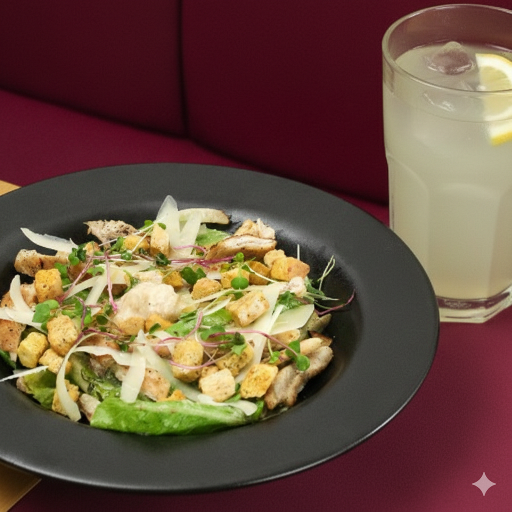 Ensalada con lechuga romana rebosada en salsa cesar, acompañada de pollo parrillado, crotones de pan y queso parmesano.