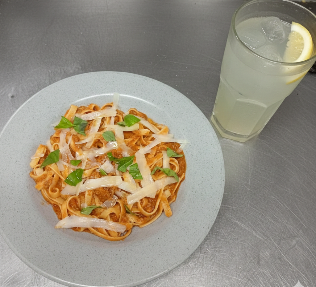 Lasagna bolognesa acompañada de limonada natural