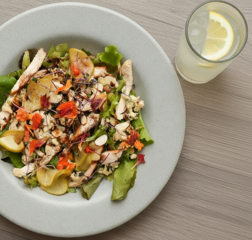 Pollo a la parrilla, trozos de queso azul, almendras laminadas, manzana verde confitada sobre mix de lechuga baby y reducción de balsámico
