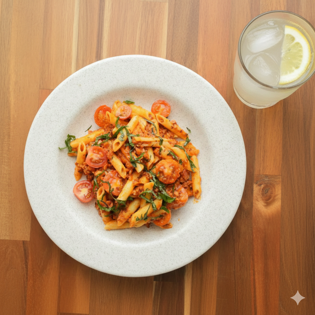 Pasta penne salteada con tocineta rostizada y hojas de albahaca fresca, finalizada en salsa napolitana con un toque de peperoncino y queso parmesano.