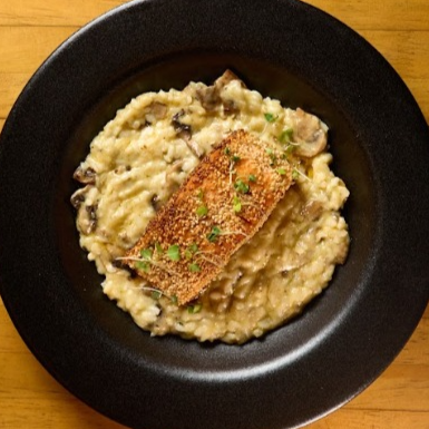 Pasta penne en salsa blanca, con trozos de salmón crocante, champiñones, tocineta, aceitunas y albahaca genovesa.