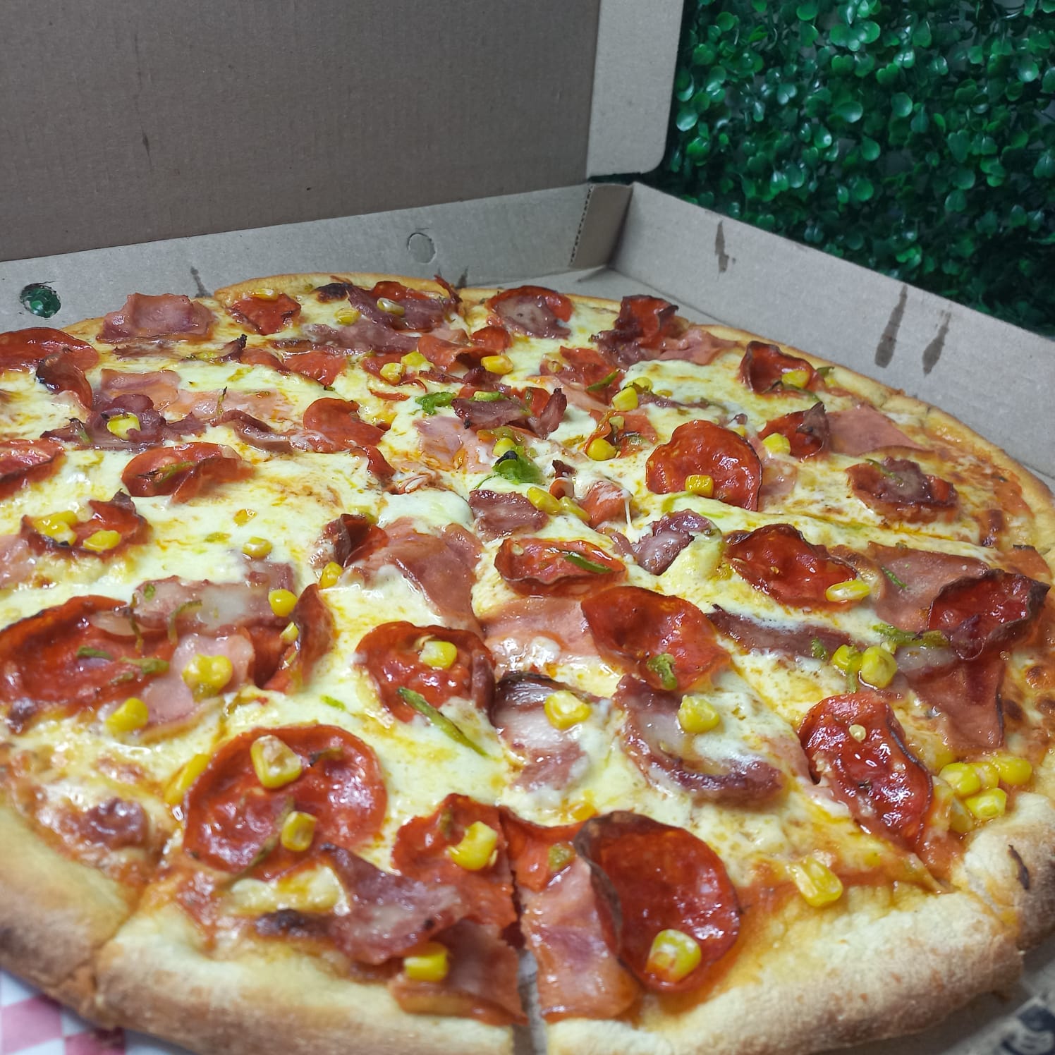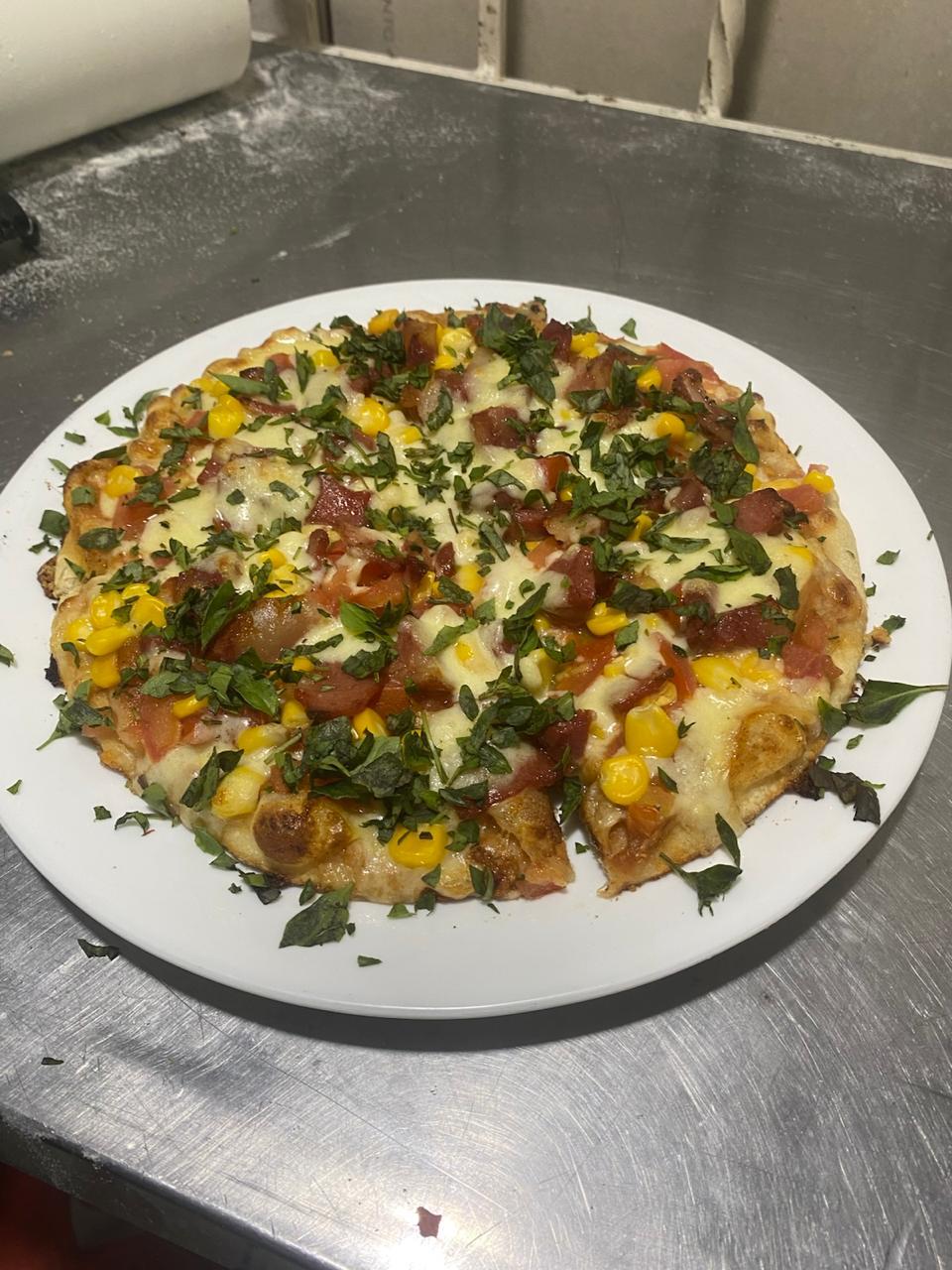 Queso ,cebolla, pimentón, champiñón, maíz tierno y tomate.