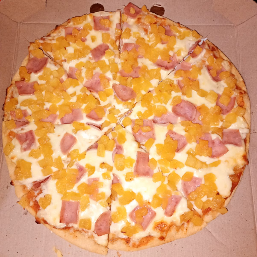 deliciosa pizza de masa de harina de trigo, pasta de tomate, queso mozarella, jamon, piña