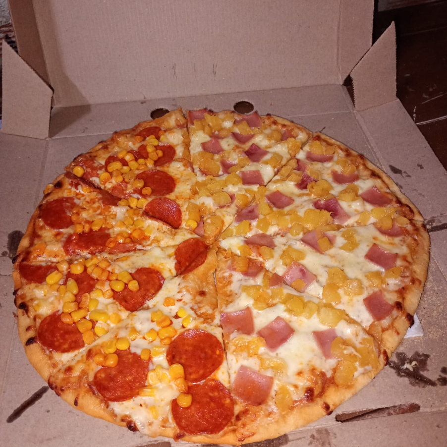 deliciosa pizza de jamon, tocneta maiz, hawaiana, peperone