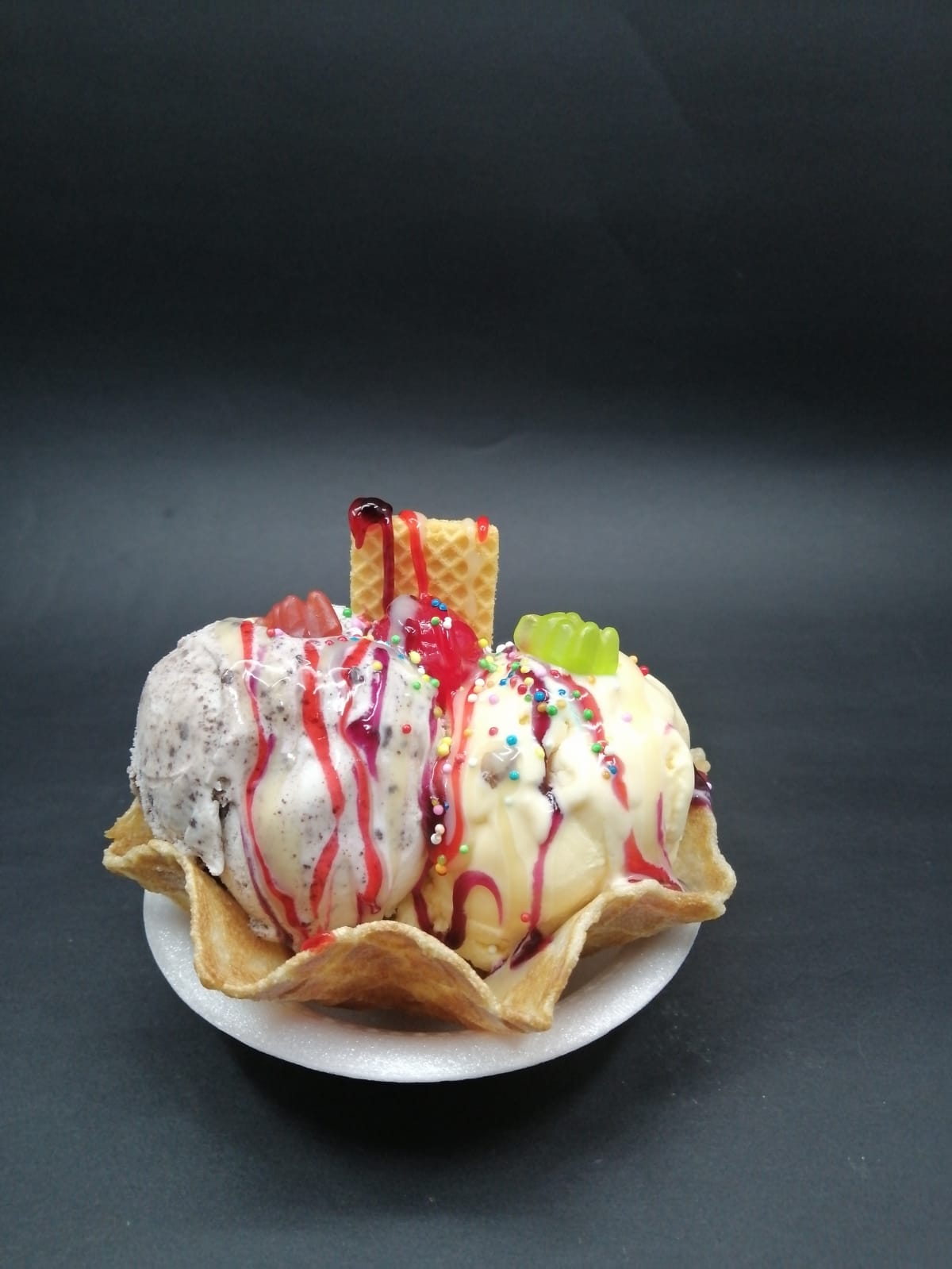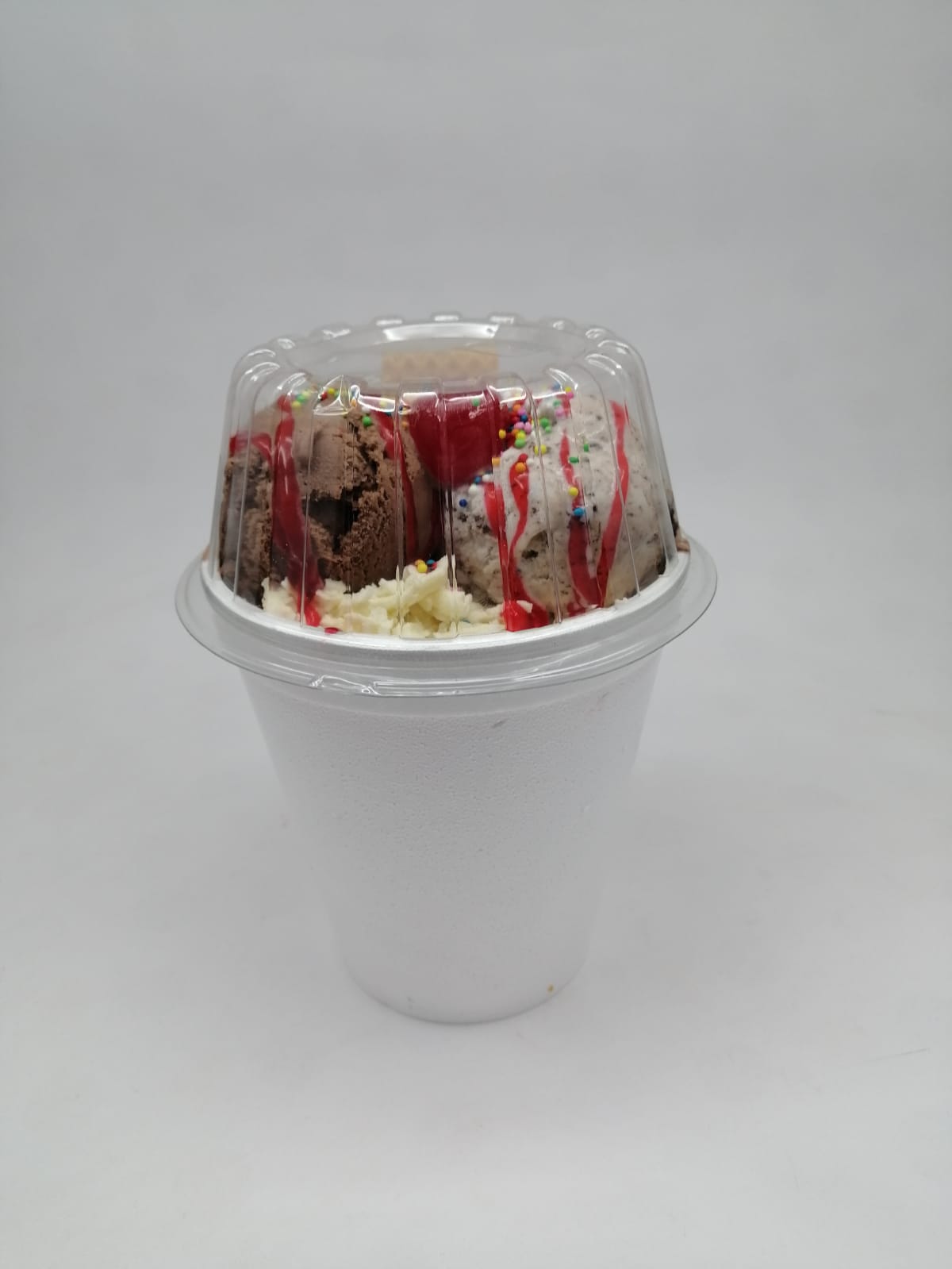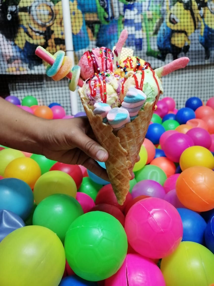 3 bolas de helado al gusto, gomitas, salsa, grageas.