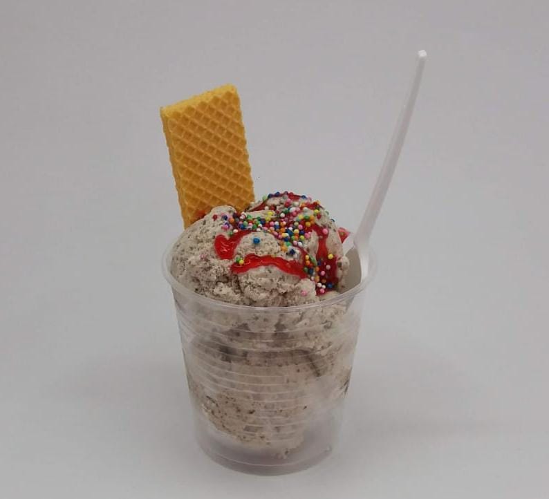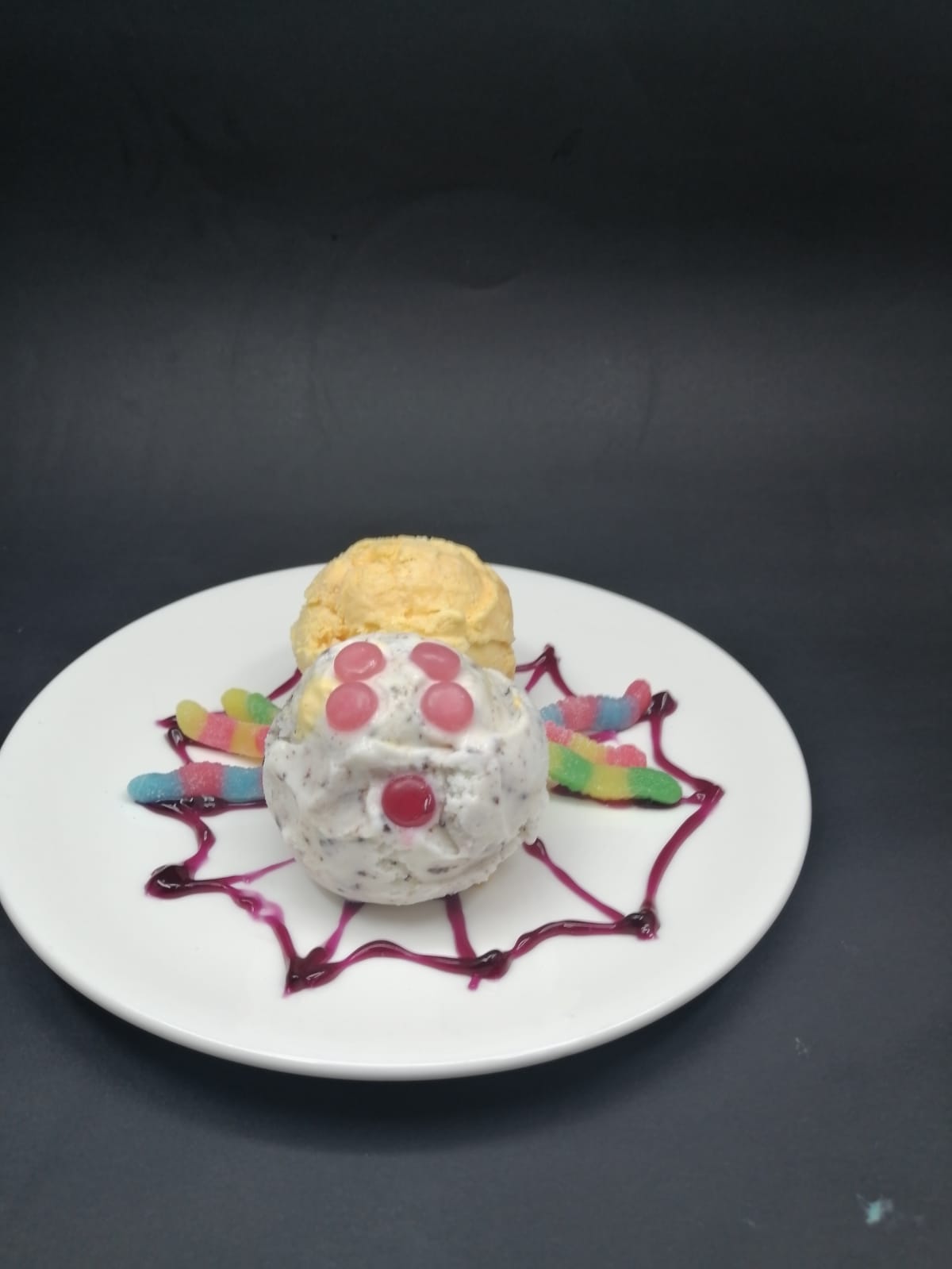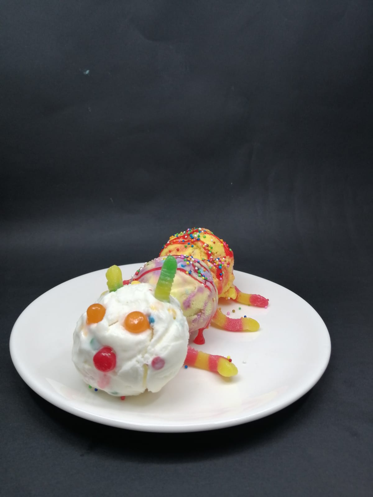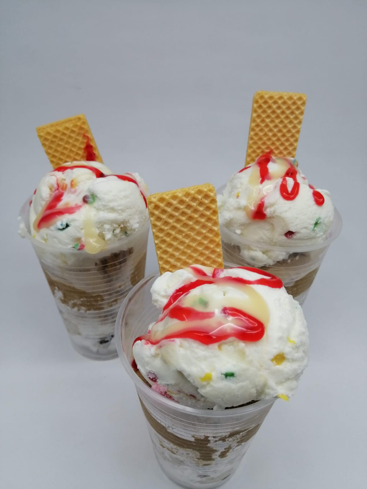 3 bolas de helado al gusto, gomitas, salsa, grageas.