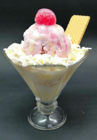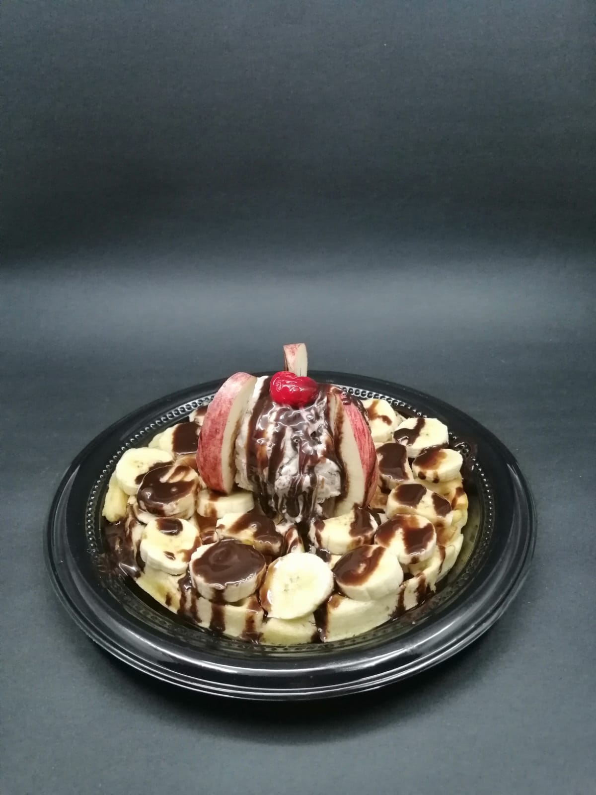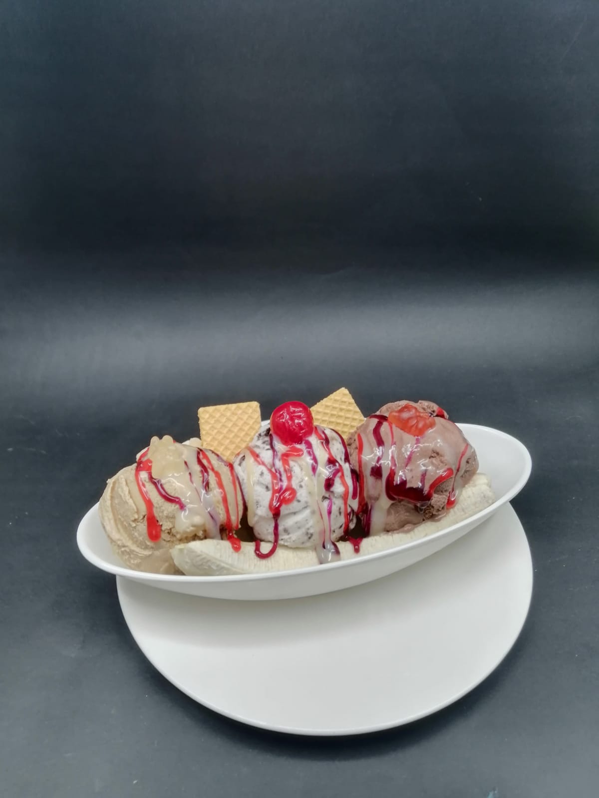 3 bolas de helado, banano, glaseado de mora, fresa, leche condensada, cereza.