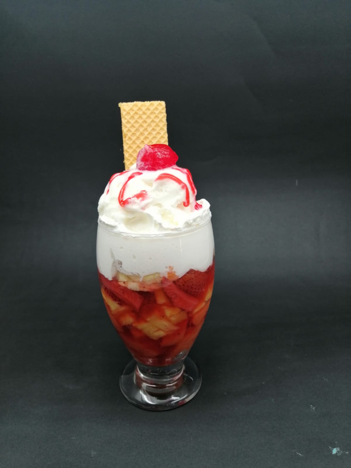 Papaya, piña, uva, fresa, banano, una bola de helado, cereza, galleta.