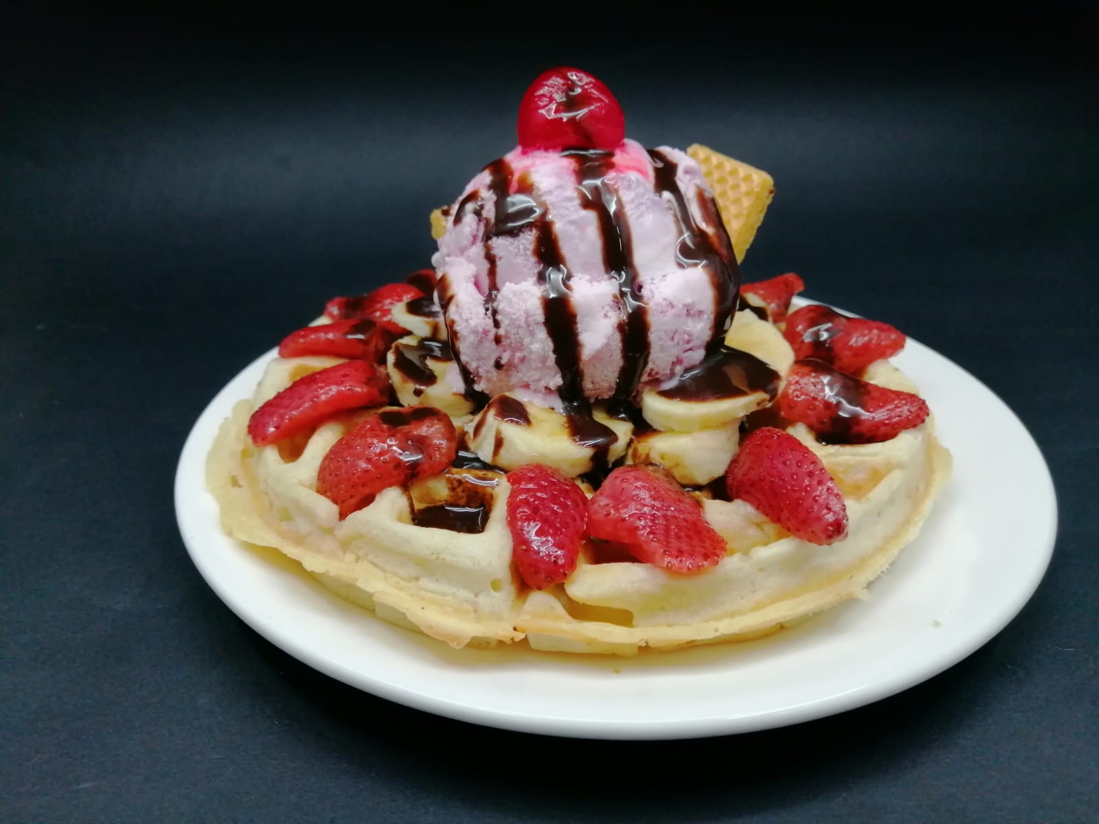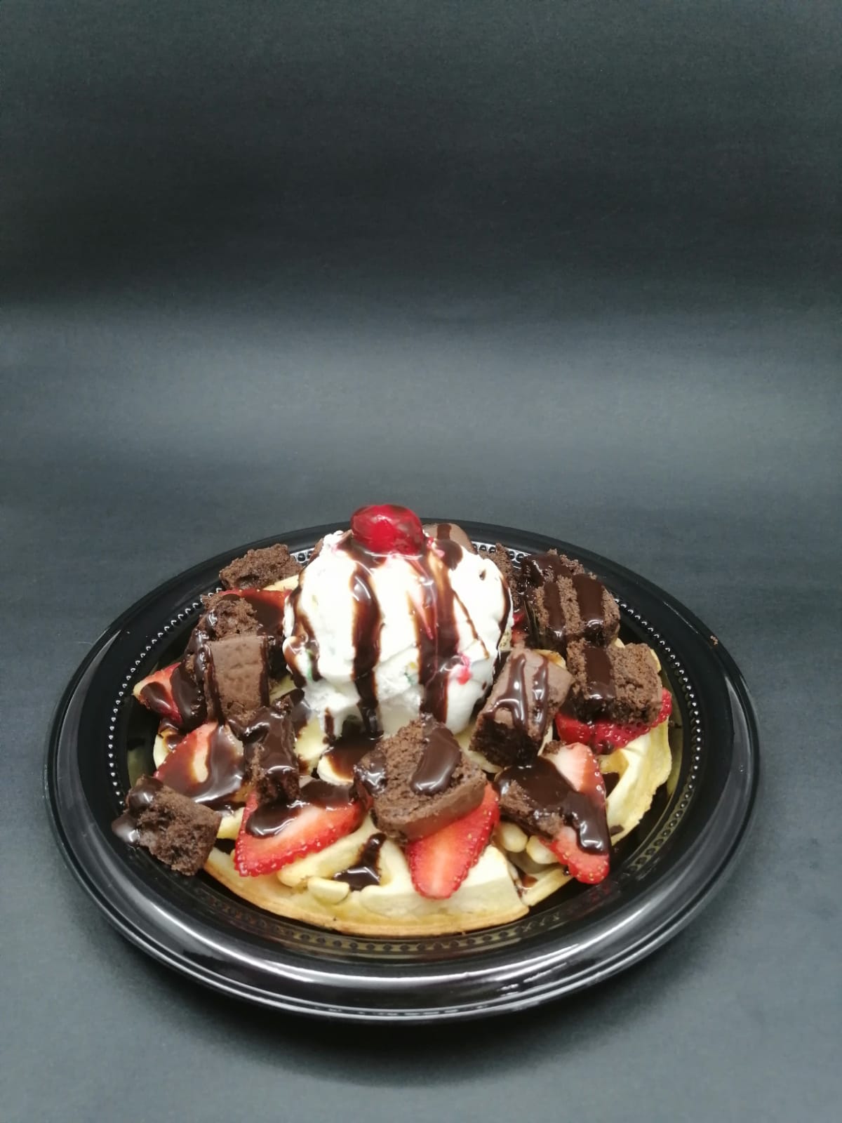 Waffle, fresas, banano, glaseado de chocolate, una bola de helado.