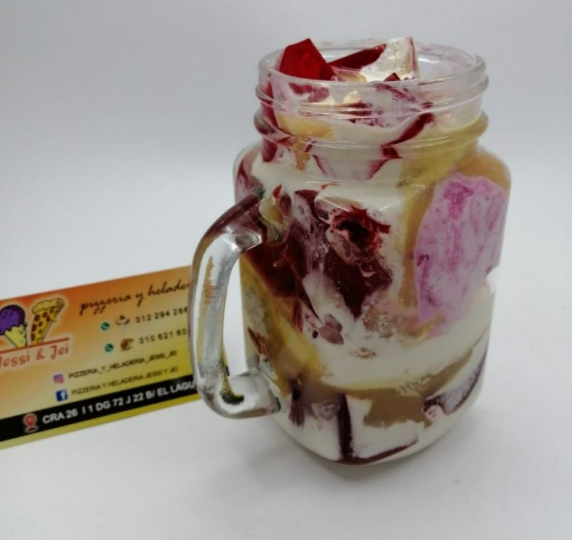 Dos bolas de helado, gelatina, crema de leche, leche condensada.