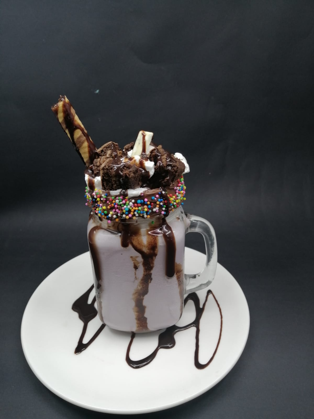 4 bolas de helado grandes, leche, glaseado de fresa, brownie en cuadritos, barquillo y decoración.