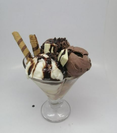 3 bolas de helado, chocolate, salsa de chocolate, chocobreak, barquillo.