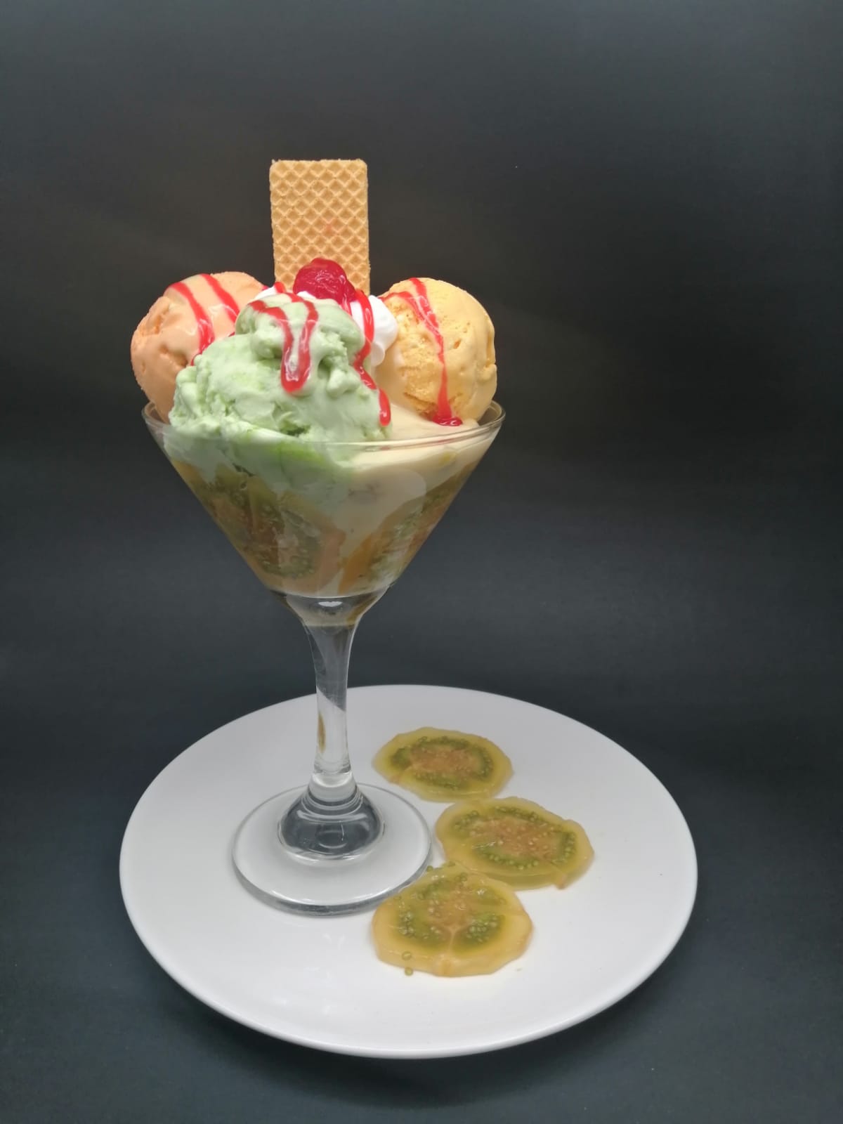 4 Bolas de helado, salsa de maracuyá, cereza.