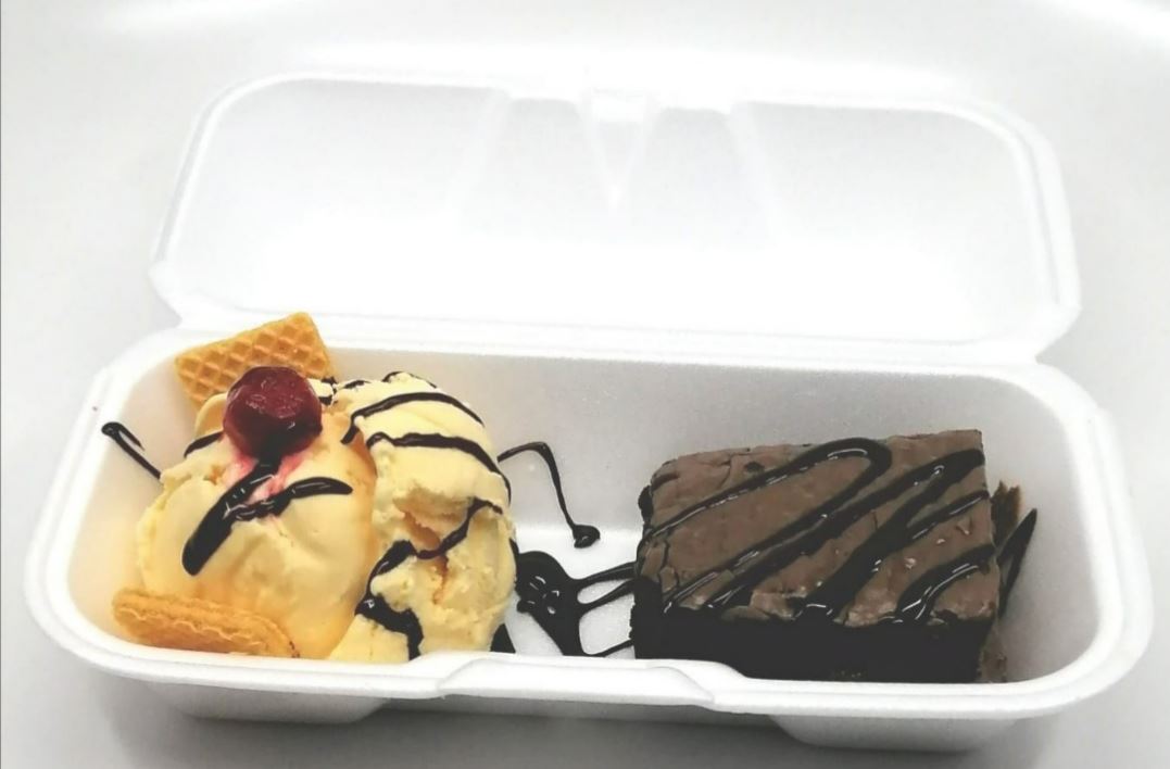 Banano, fresas, brownie cortado en cuadritos, una bola de helado, salsa de chocolate.