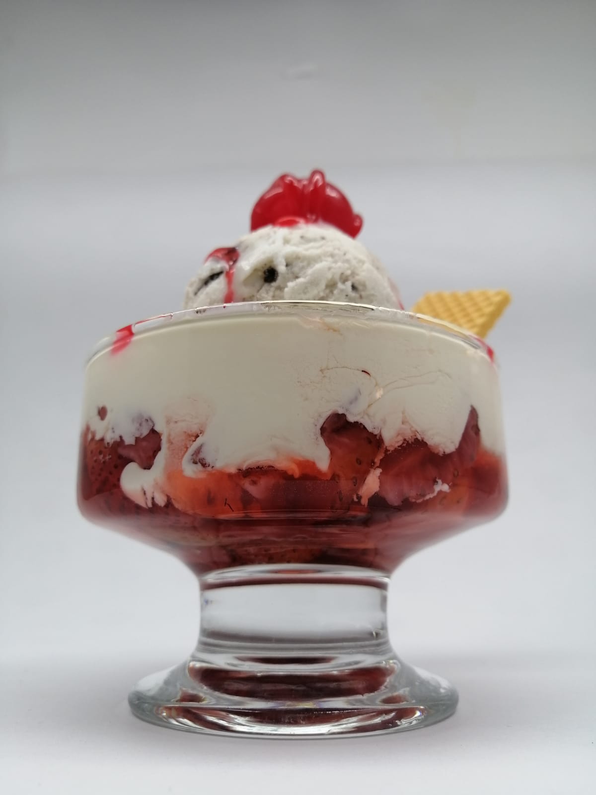 Dos bolas de helado, glaseado de Mora, fresa, leche condensada, cereza.