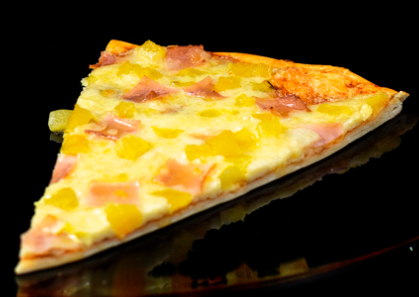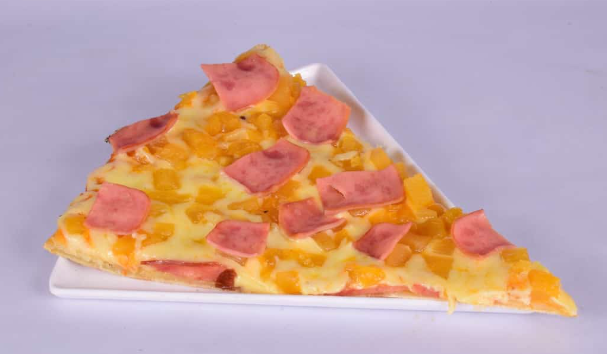 Porción de pizza de masa artesanal, jamón, piña y queso mozzarella.