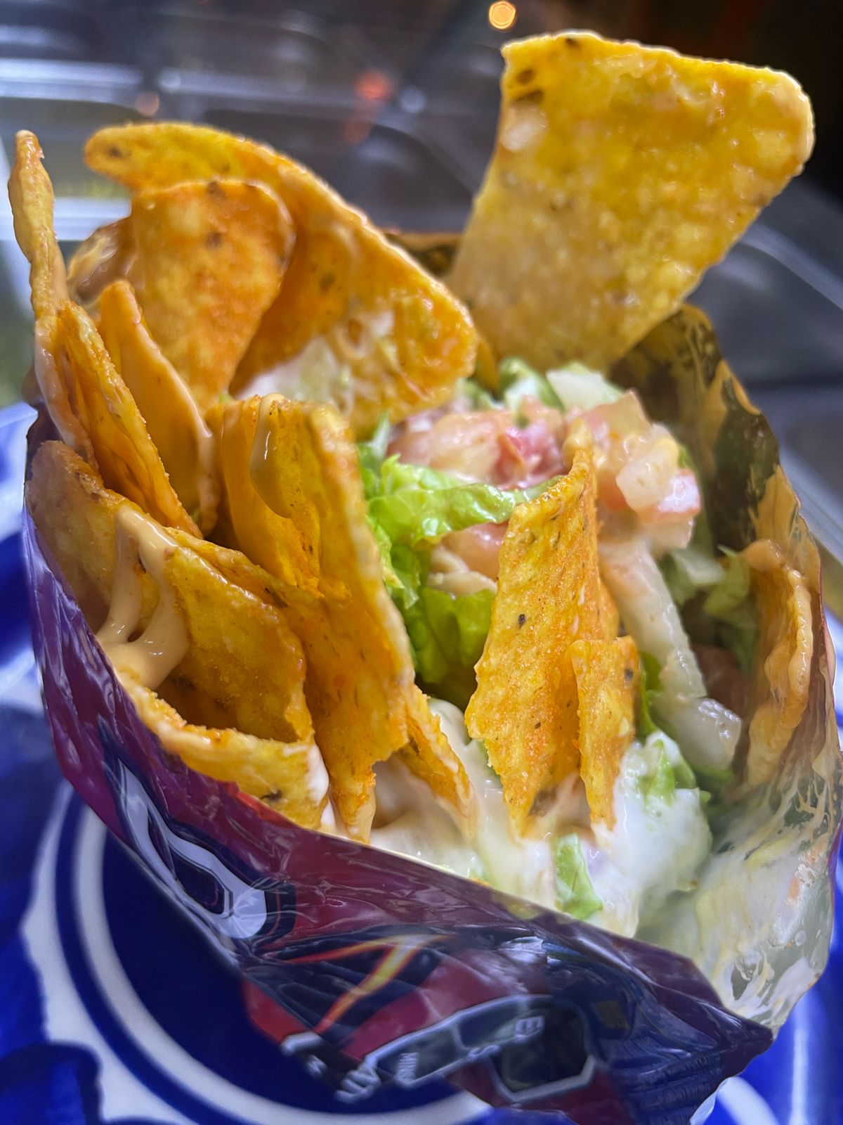 Doritos con carne, pollo, maicitos, lechuga, pico de gallo, guacamole y salsa de la casa