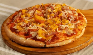 Pizza con masa artesanal, queso mozzarella, jamón, maduro, maíz y tocineta.