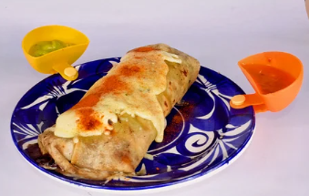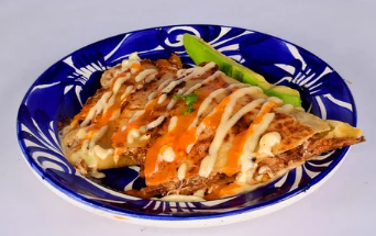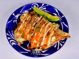 Tortilla de maíz, queso mozzarella, pollo y carne.
