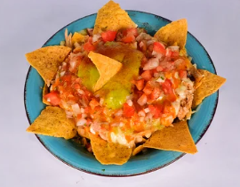 Nachos, frijol negro, queso mozzarella, salsa chipotle, pico de gallo, guacamole, pollo y carne.