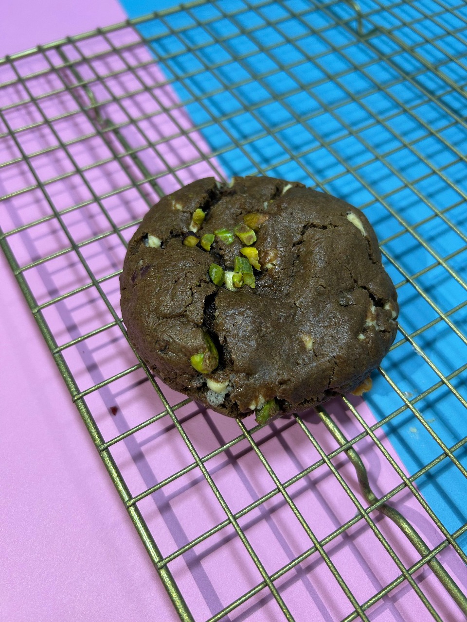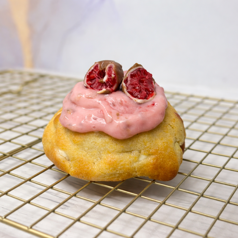 Galleta suave con topping de crema de fresa y frambuesa cubierta de chocolate.