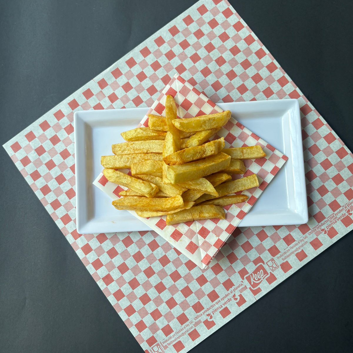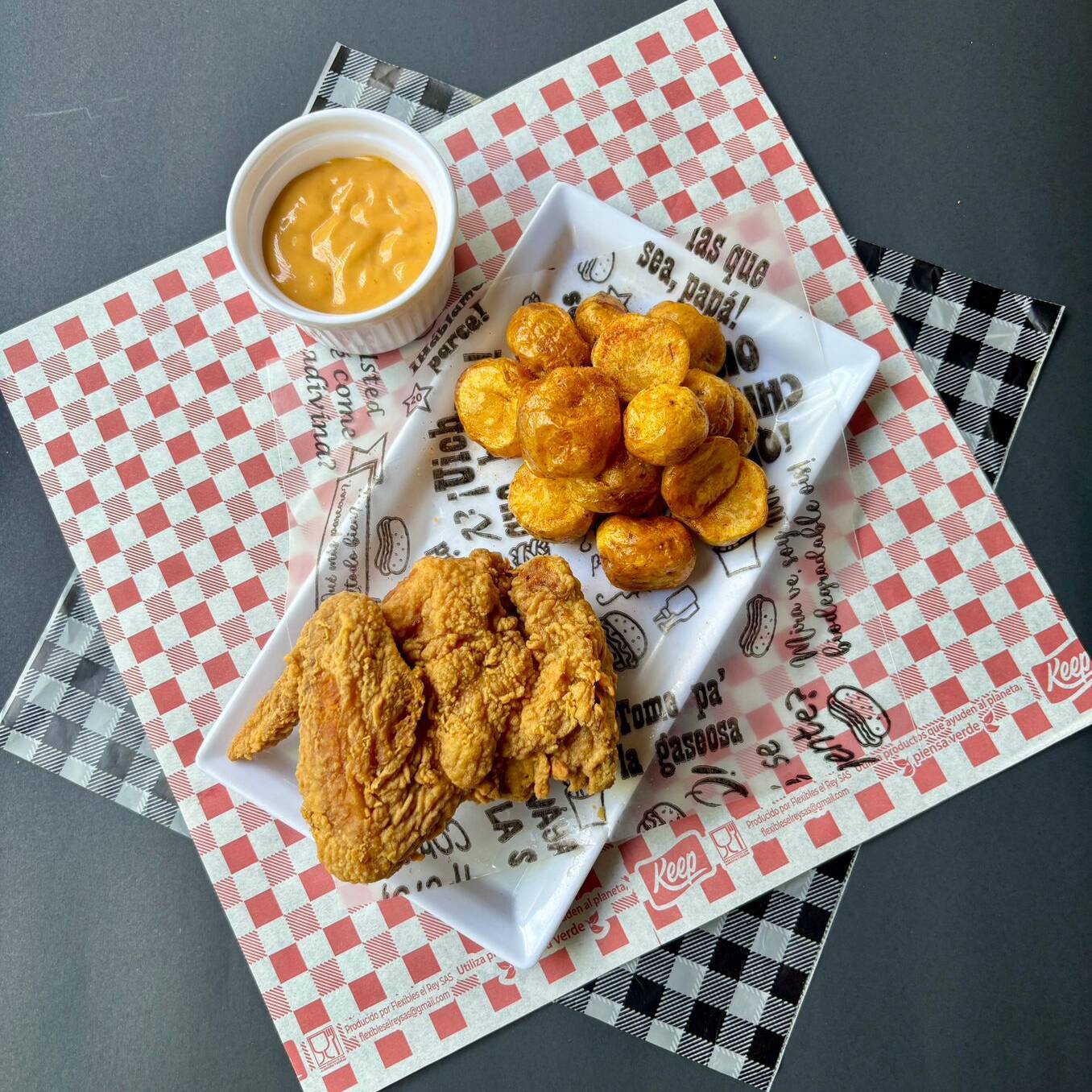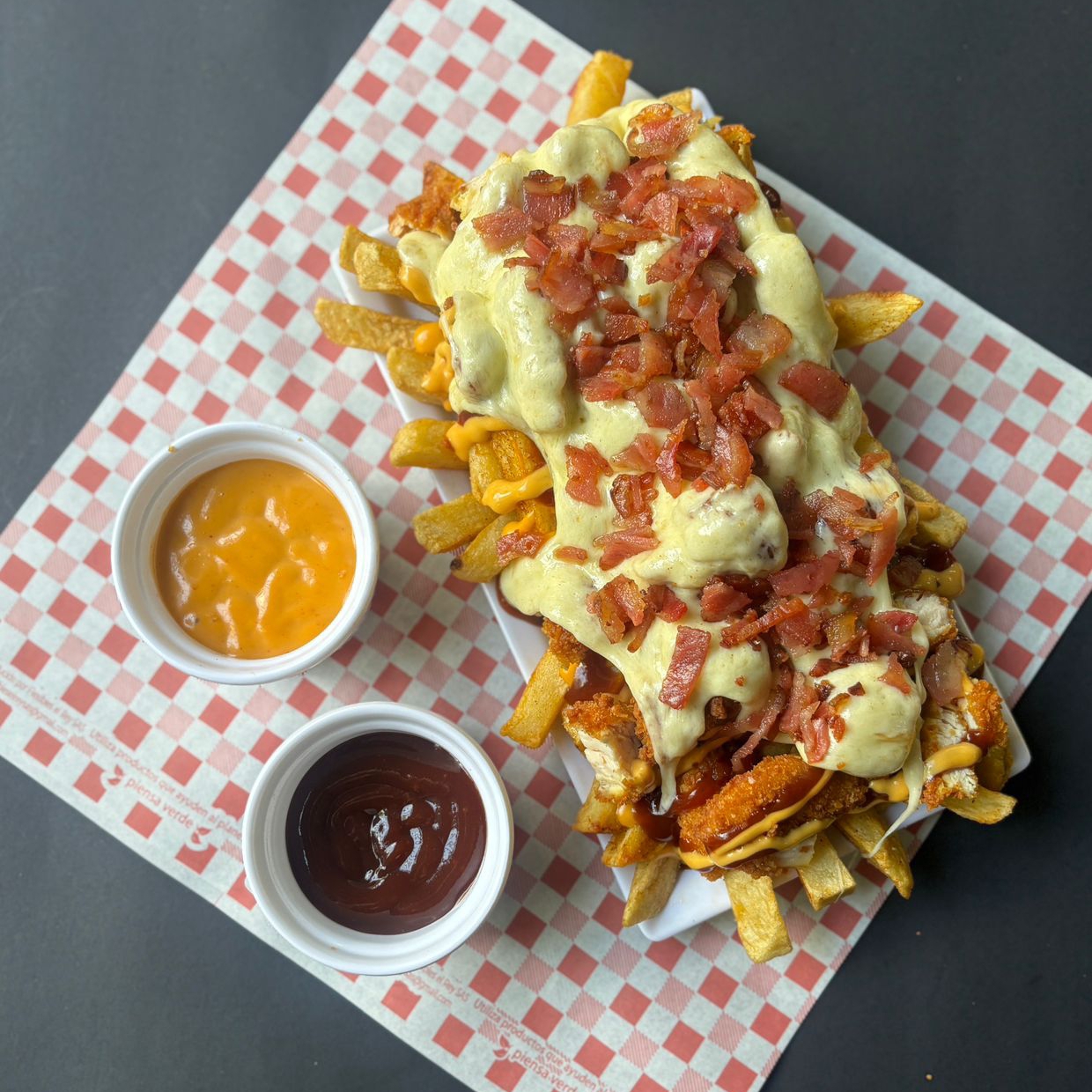 Base de papas a la francesa con trozos de pechuga + Queso gratinado con tocineta + Salsa de la casa con BBQ