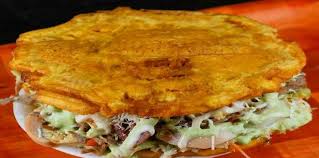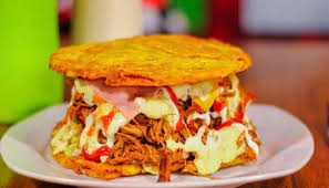 Patacón de pollo, res y salsa de la casa.