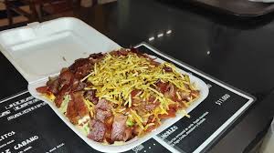 Papas, salchicha, ripio, queso, tocineta y salsa de la casa.