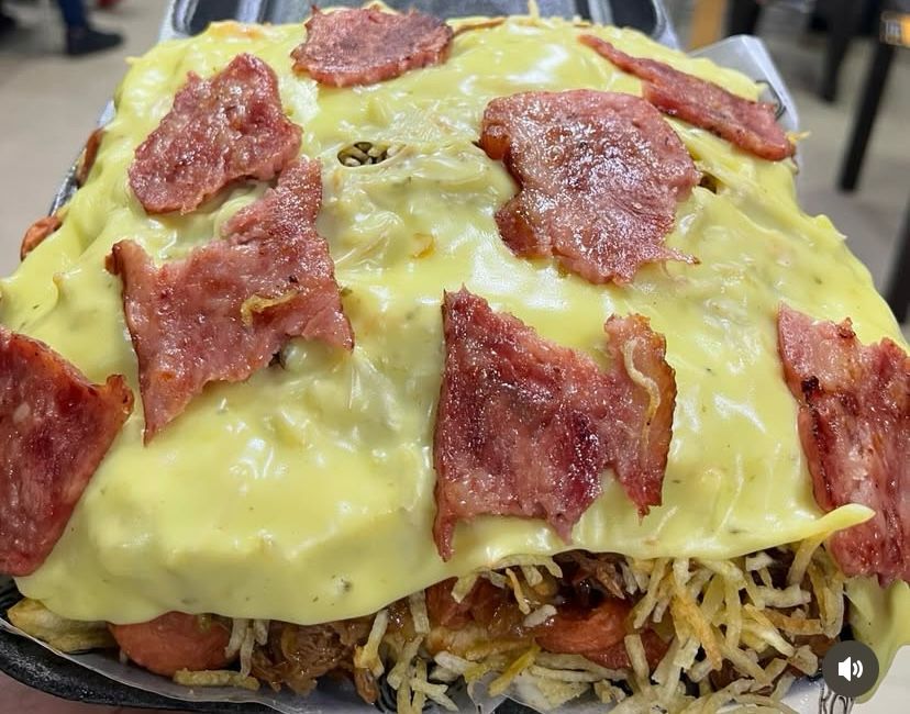 Papas, salchicha, ripio, queso, tocineta, pollo y salsa de la casa.
