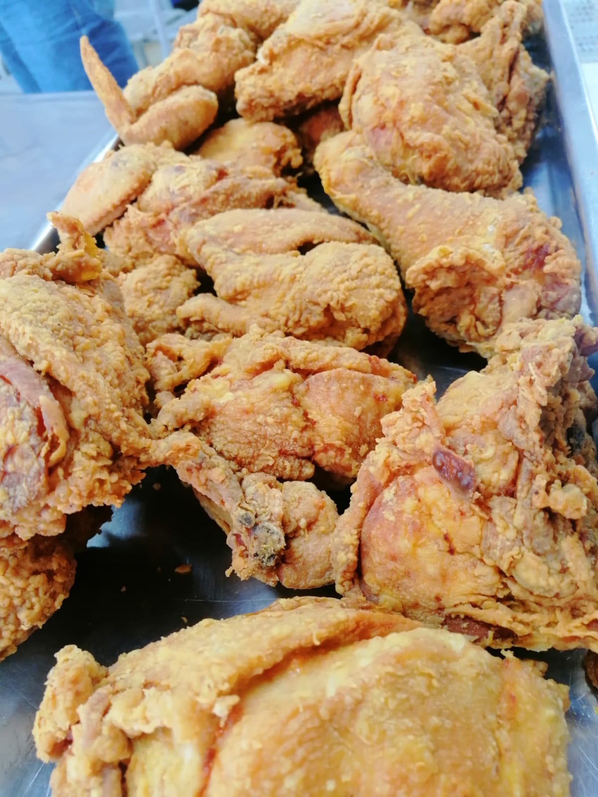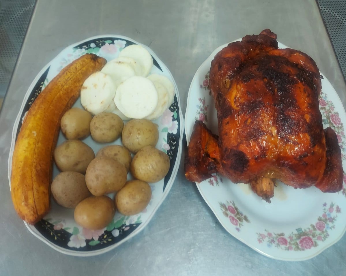 Un pollo asado o apanado entero con adición de maduro, papa cocida y gaseosa familiar.