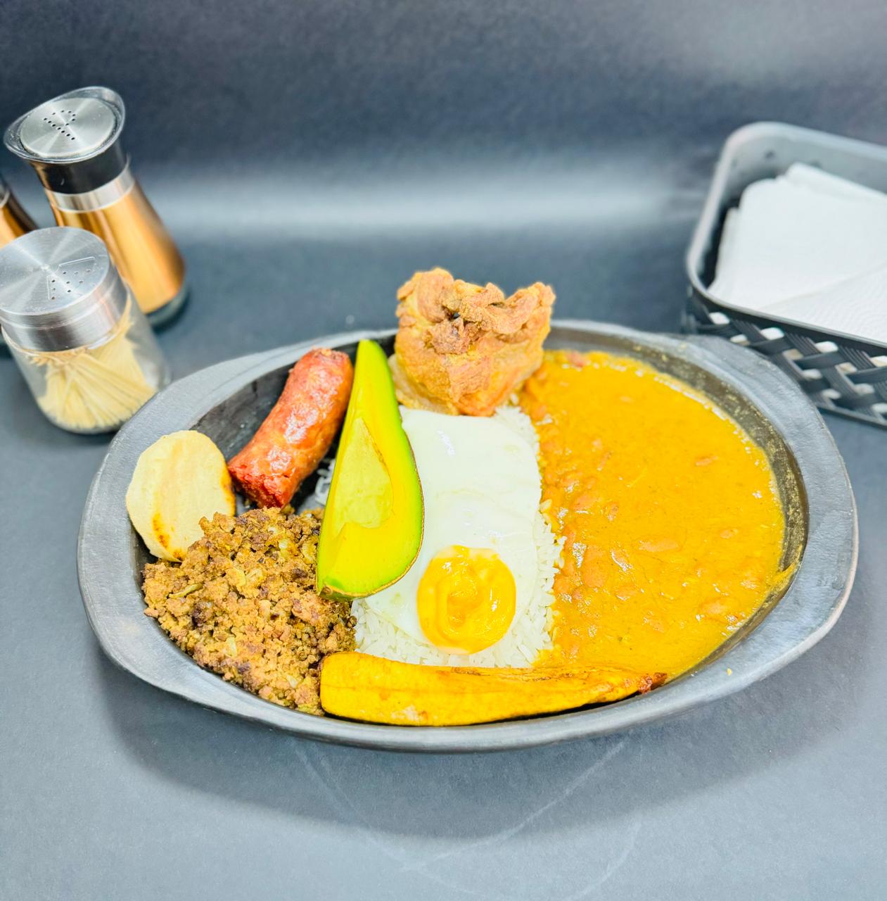 Frijol, Arroz, carne Molida, Chorizo, Tajada, Chicharrón, Aguacate y Arepa