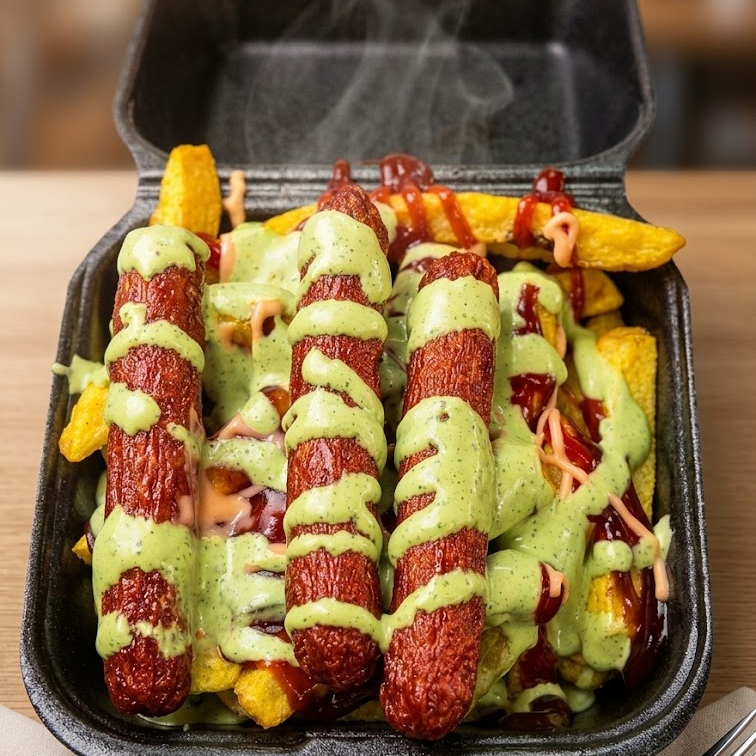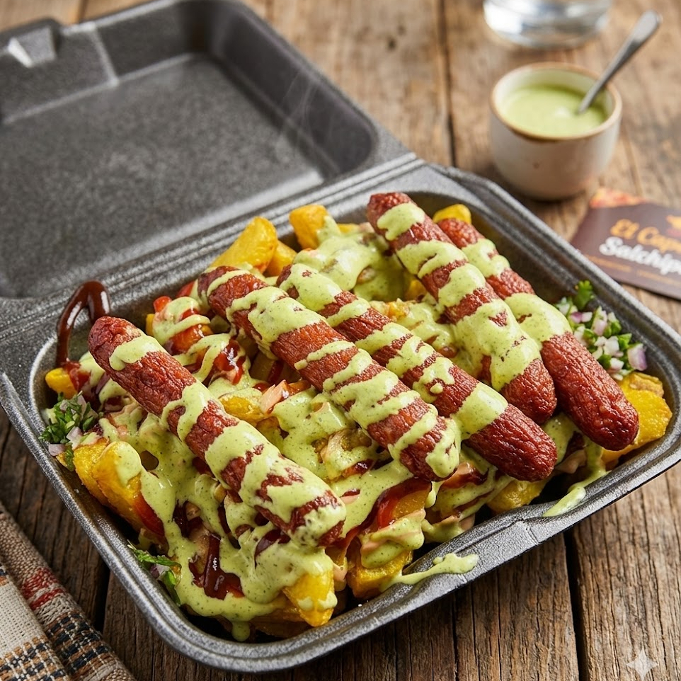 Tres salchichas tipo ranchera premium, perfectamente doradas y con su característico toque ahumado, servidas sobre una generosa base de papas amarillas fritas crocantes. Bañadas con nuestra selección de salsas de la casa
