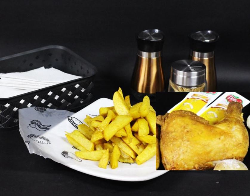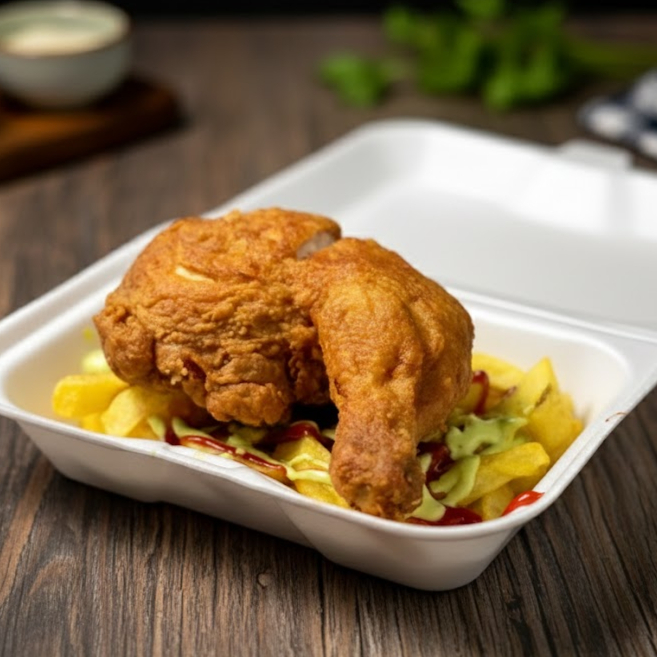 Grande, Delicioso, jugoso y Crocante Pernil de Pollo (muslo y contramuslo) a la Broaster, acompañado de una porción generosa de Papas a la francesa con Salsas de tomate, BBQ, de la Casa.