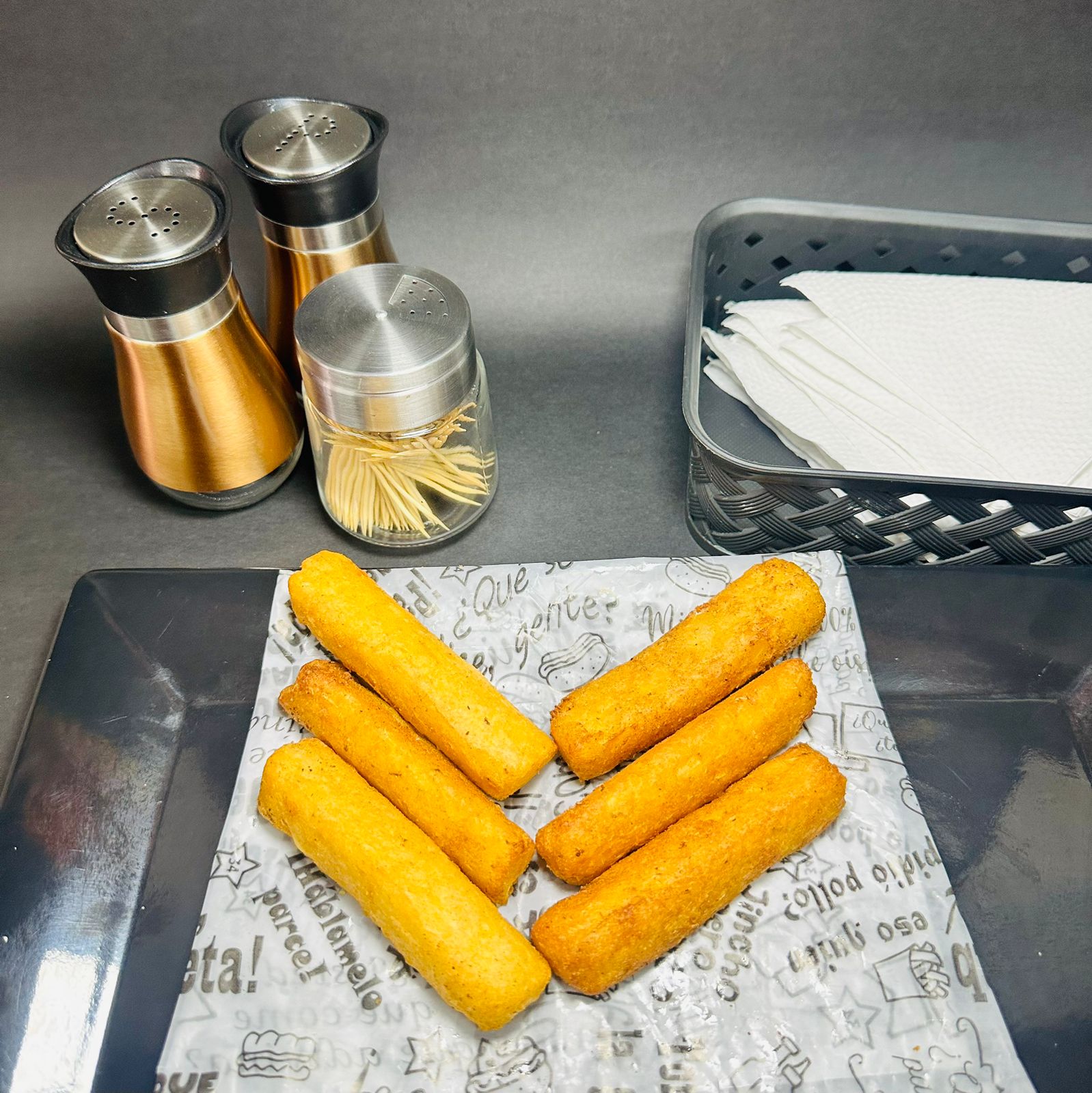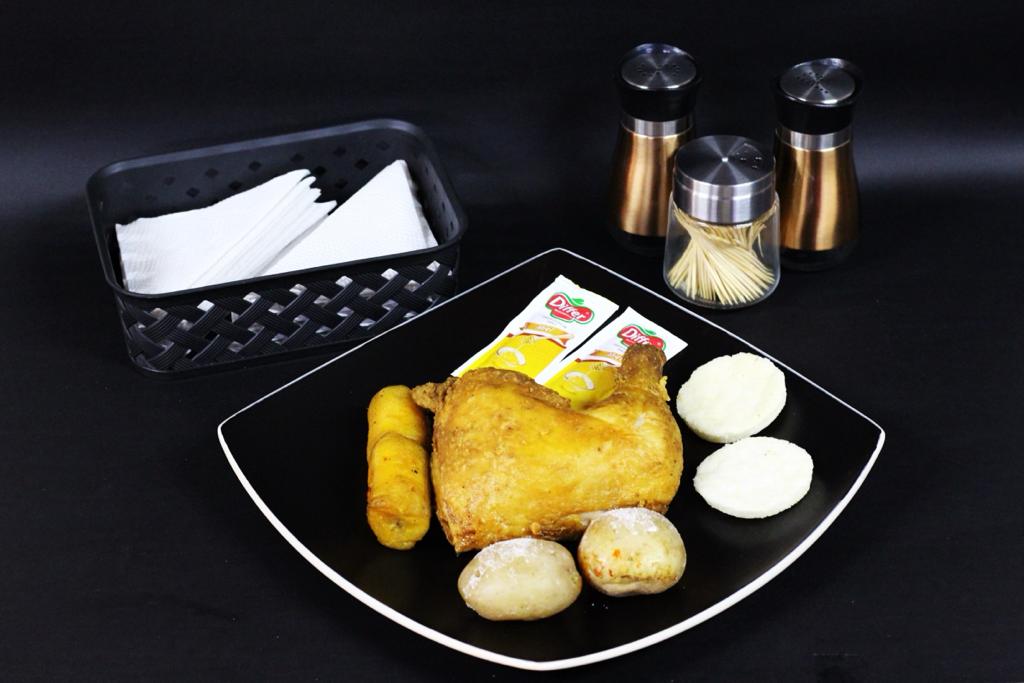 Medio Pollo Apanado, Papa ( 3 piezas) ,Arepa ( 3 piezas) y Maduro ( 3 piezas) , 2 sobres de miel y dos de salsa tomate.
