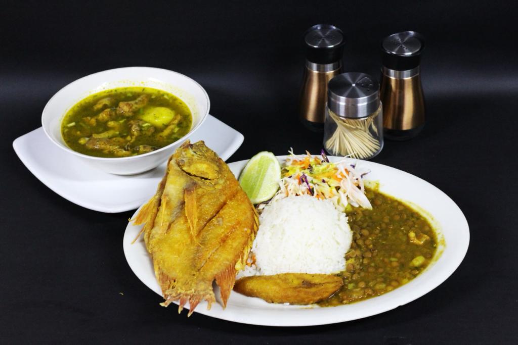 Almuerzo completo con Consomé, Tilapia Frita, Frijoles, Arroz, Ensalada y Tajada.