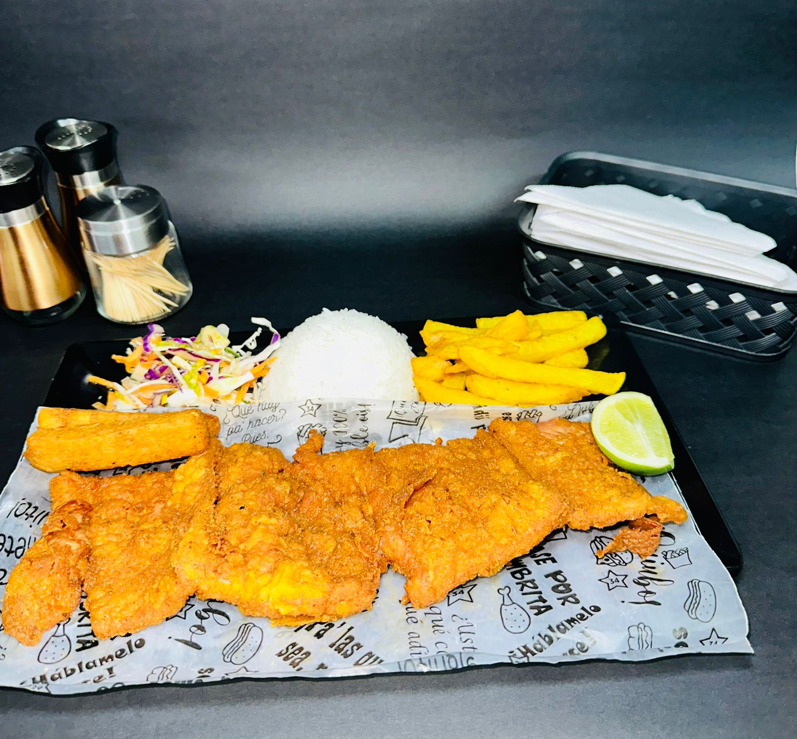 Chuletón de pollo son más de 300 gramos de chuleta, Acompañado de papas francesa, arroz, ensalada y croquetas de yuca.