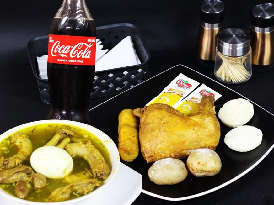 Un Cuarto de Pollo Apanado acompañado de un delicioso consomé de menudencias, y una gaseosa personal. Puedes completar tu pedido con alguna adición si lo deseas.