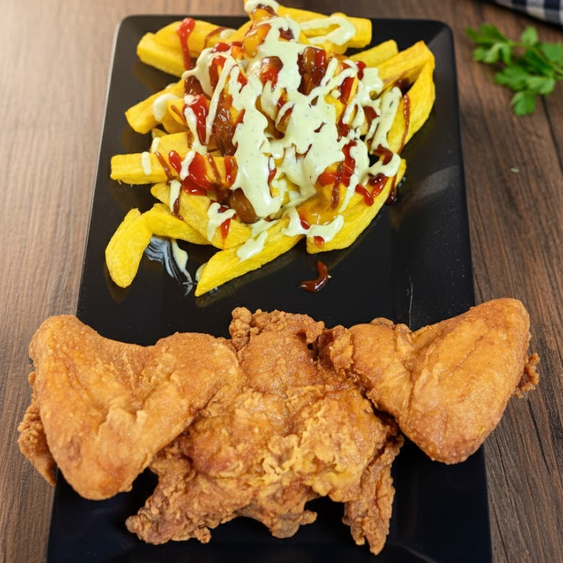 Grande, Deliciosa, jugosa y Crocante Ala Doble a la Broaster, acompañada de una porción generosa de Papas a la francesa con Salsas de tomate, BBQ, de la Casa.