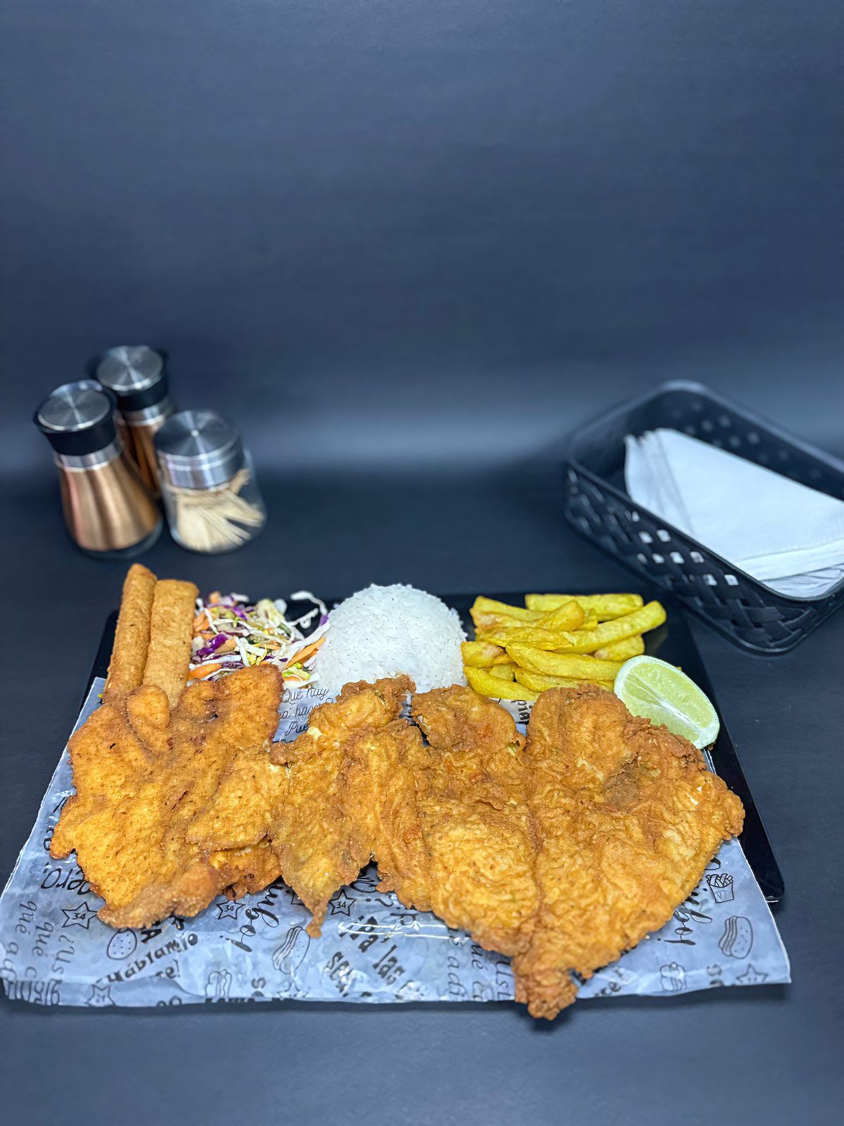 Filete de pollo, arroz, ensalada, Papas a la francesa, ensalada y croquetas de yuca