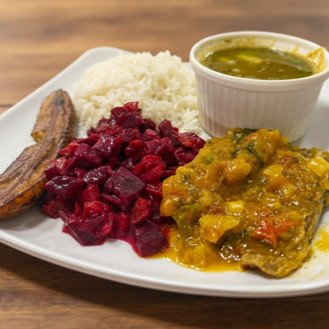 Delicioso almuerzo meridional acompañado de Proteína a elección, Sopa del día (Consomé o Sancocho) ,Principio del día (Frijoles o Lentejas), ensalada del día y rica limonada natural.
