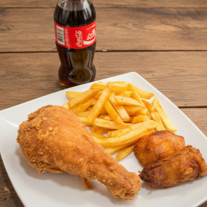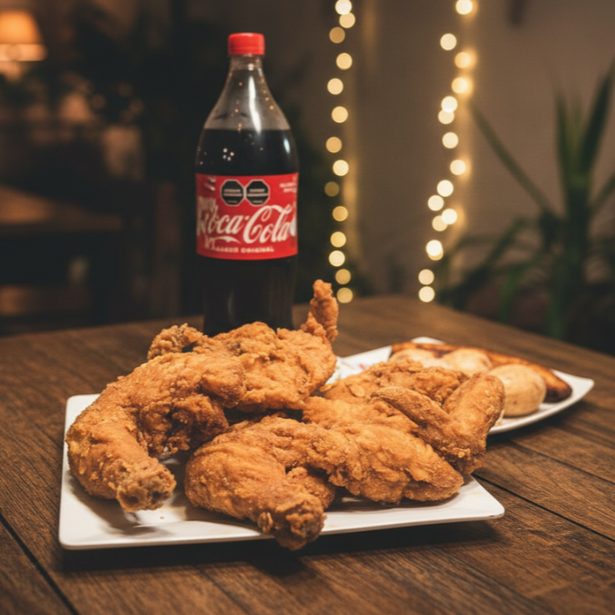 1 Pollo apanado (8 presas) acompañado de papas a la francesa, delicioso maduro, gaseosa 1.5 L a elección y salsas y syrop de miel.
