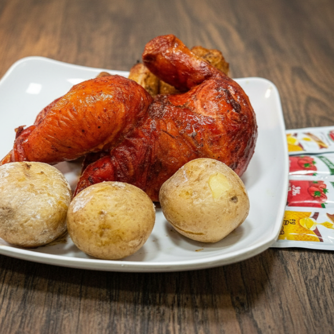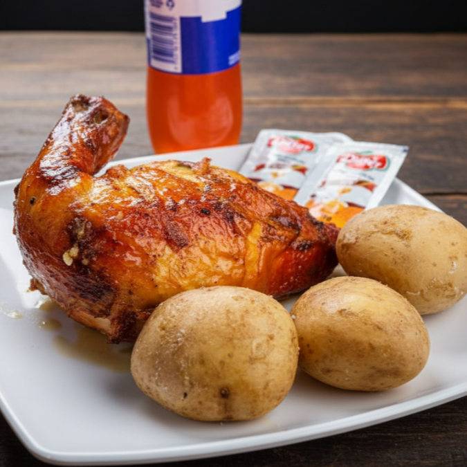Medio pollo asado (4 presas, muslo, contramuslo, pechuga y ala) acompañado de papa cocida y maduro